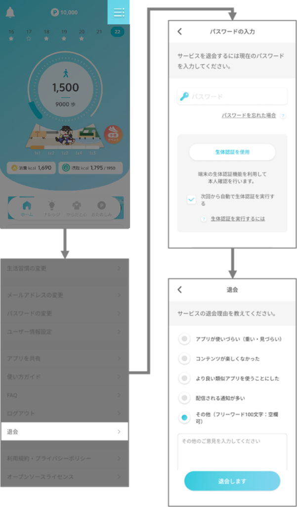 退会方法は画面の案内に従ってください。