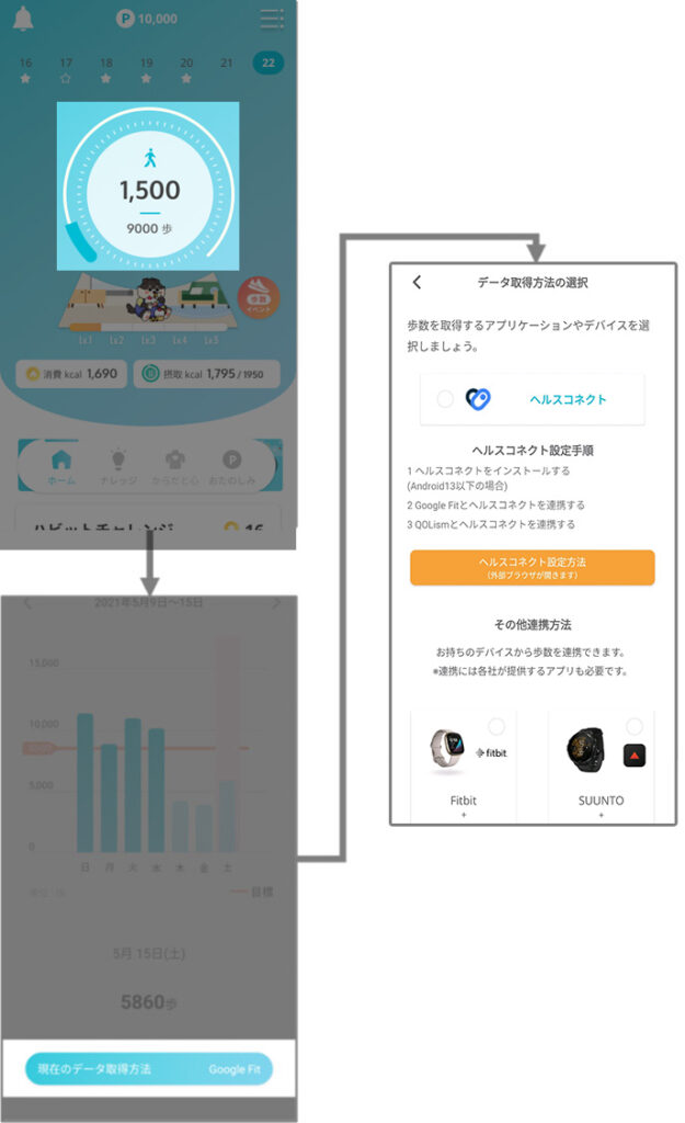 歩数の取得方法の変更は「現在のデータ取得方法」より変更が可能です。