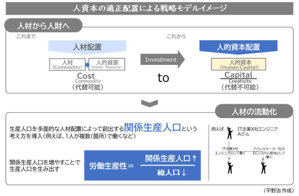 このことを人的資本の変革の観点で考えるとするならば、一人ひとりが人資本としてのパフォーマンスを多面的に活かす仕組みづくりが必要であり、「関係生産人口」という言葉で表現することができるのではないでしょうか。1人の生産人口を複合化していく「関係生産人口」の考え方をベースに、人資本の適正配置を考える戦略モデルを構築していくことがより求められる時代になってくると考えています。