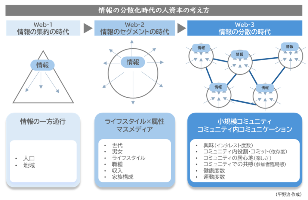 例えば、集中化の時代であれば、情報は集めること(ストレージ)であったものが、分散化になると情報は個人が台帳を持つことになります。人資本といった視点でこのことを考えた場合、より個人が持つポテンシャルを引き出しやすい社会環境になると考えられます。